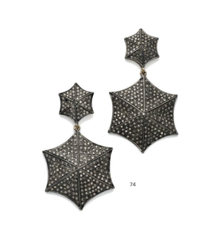 | A pair of platinum, onyx, and diamond pendant earrings, Cartier, circa 1925. |