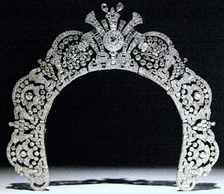 | A unique diamond kokoshnik tiara, in which blue enamel has filled in the spaces in the floral design. This is by far my most favorite tiara. |